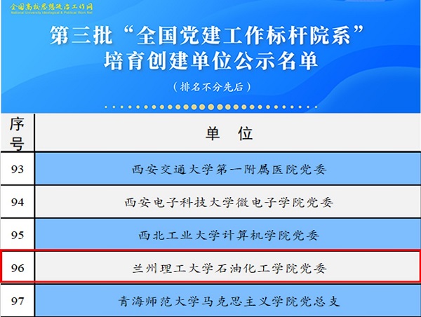 根据《教育部办公厅关于开展第三批新时代高公司党建示范创建和质量创优工作的通知》(教思政厅函〔2021〕16号)安排,经省级党委教育工作部门推荐、资格审查、专家推荐、教育部党的建设和全面从严治党工作领导小组成员单位集中审议、结果公示,遴选产生了11个全国党建工作示范高校、100个全国党建工作标杆院系、1000个全国党建工作样板支部培育创建单位。各培育创建单位建设周期为2年,自通知发布日起至2024年3月。
