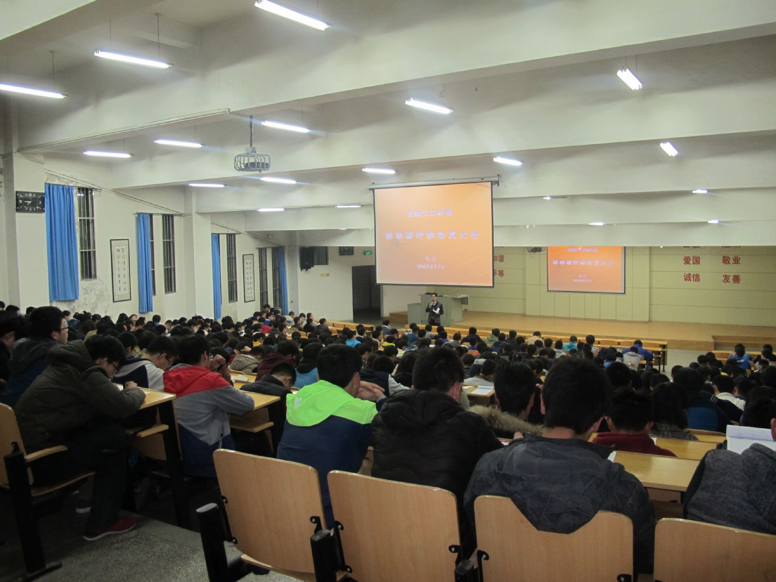 辅导员赵龙老师将上学期各班学分平均成绩排名向大家作了通报,对于存在的挂科现象进行了原因分析,勉励成绩优秀的同学和班级继续努力学习,戒骄戒躁;希望挂科的同学们勤能补拙,切勿自暴自弃,在新的学期争取进步。鼓励各班之间取长补短,加强交流,相互借鉴好的学习经验和方法,希望各班同学们在新的学期制定新的学习计划,形成共同探讨学习方法、共同取得进步的良好氛围,促进良好班风形成。