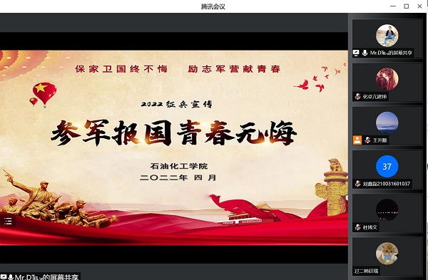 风华正茂恰少年,参军报国正当时。2022年秋季征兵已经全面展开,为切实做好公司征兵工作,激发全体同学的参军热情,4月12日下午,懂球体育组织2021级本科生开展了线上征兵宣讲活动,会议由辅导员戴文韬老师主持。
