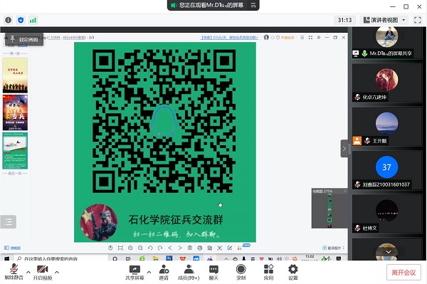 本次宣讲会首先组织全体同学观看了中央军委国防动员部摄制的微电影《参军报国 不负韶华》《逐梦青春》,接着从老员工参军意义、参军优惠政策、参军条件及流程等方面进行了政策宣讲,最后指导同学们如何进行兵役登记和应征报名。